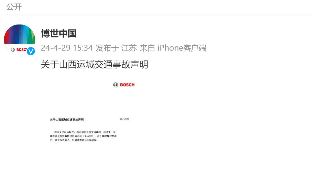 4月28日,博世针对问界m7山西运城事故发布声明称,经调查,涉事车辆没有搭载博世智驾系统(含aeb)。